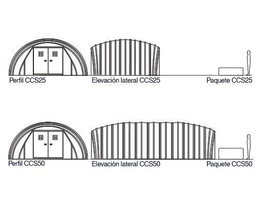 Las estructuras de CCS consisten en Concrete Canvas® fijado a un interior inflable con conjuntos integrales de puertas de acero integral en cada extremo.