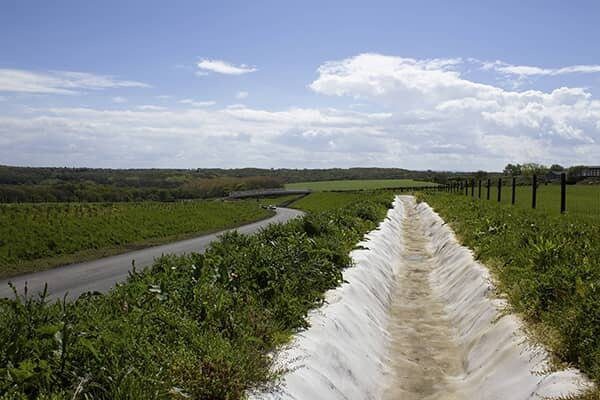 During periods of peak rainfall the equivalent of an Olympic sized swimming pool drained off the adjacent field. This was stopping us from progressing with the road construction. Using CC to line the ditches meant that the water was controlled and directed away from the site to stop it flooding.