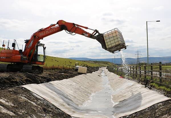 I was overseeing the installation of Concrete Canvas® (CC) on a project I was working on with Alun Griffiths known as Five Mile Lane. The client was Vale of Glamorgan Council. We installed over 2000m² of CC8 as a channel lining solution for a series of cut-off ditches at the crest of the large earth cutting excavated for the new carriageway.