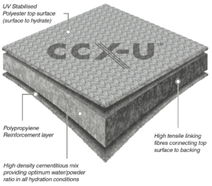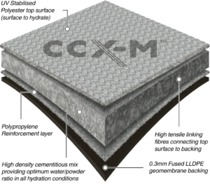 CCX® is primarily used for lining uniformly profiled erosion control applications. CCX® consists of two interconnected layers of geotextile that encapsulate a specially formulated dry concrete mix. CCX-MAT® (CCX-M®) is a variant of CCX® with an LLDPE geomembrane backing which ensures the material has very low permeability.